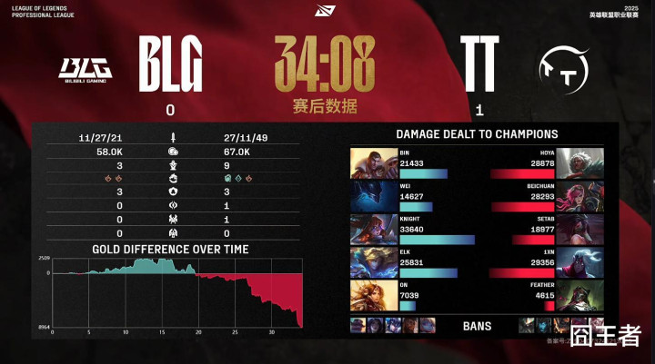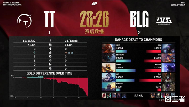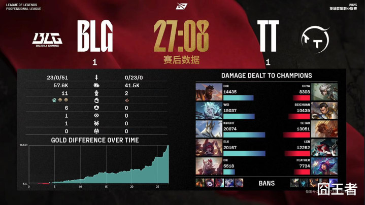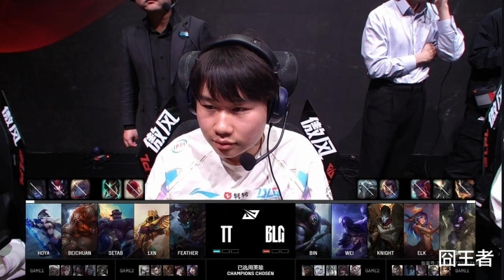 结果第二局比赛,BLG打出了一场血腥的比赛,人头数零封了TT。比赛第12分钟左右,BLG在河道打出0换2,Wei佛耶戈单杀SeTab岩雀。前期BLG打出五千优势;比赛第21分钟左右,Elk霞拉扯中单杀Beichuan赵信,BLG先后打出0换3;比赛第23分钟左右,knight加里奥砍下三杀,BLG下路团0换5大胜团灭TT;比赛第26分钟左右,BLG拿下大龙回身击杀TT三人,全场已经打出20/0;最终比赛第27分08秒,Knight加里奥再次拿下三杀,BLG打出0换3后结束比赛。