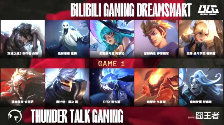 第一局比赛,B LG蓝色方,禁用波比、奎桑提、瑟庄妮、卡莎、布隆,选用杰斯、梦魇、阿萝拉、伊泽瑞尔、蕾欧娜;T T红色方,禁用蝎子、卡莉斯塔、兰博、霞、洛,选用安蓓萨、蔚、阿卡丽、韦鲁斯、烈娜塔